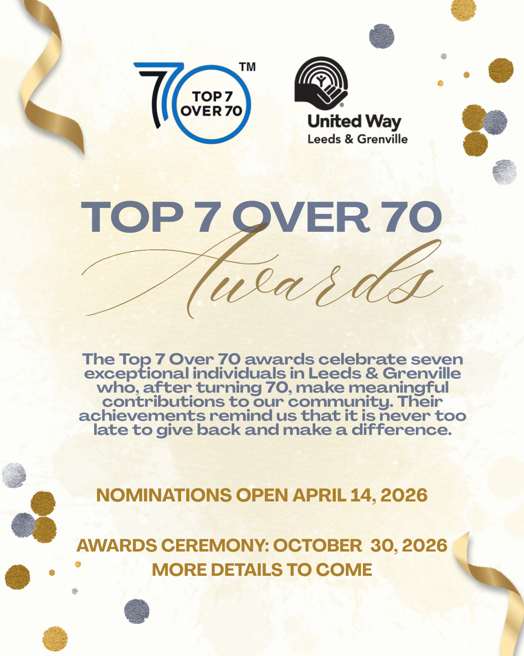 The Top 7 Over 70 event celebrates seven remarkable individuals in Leeds & Grenville who are continuing to make meaningful contributions to our community after the age of 70. These honourees show that leadership, passion, and impact do not have an expiration date.